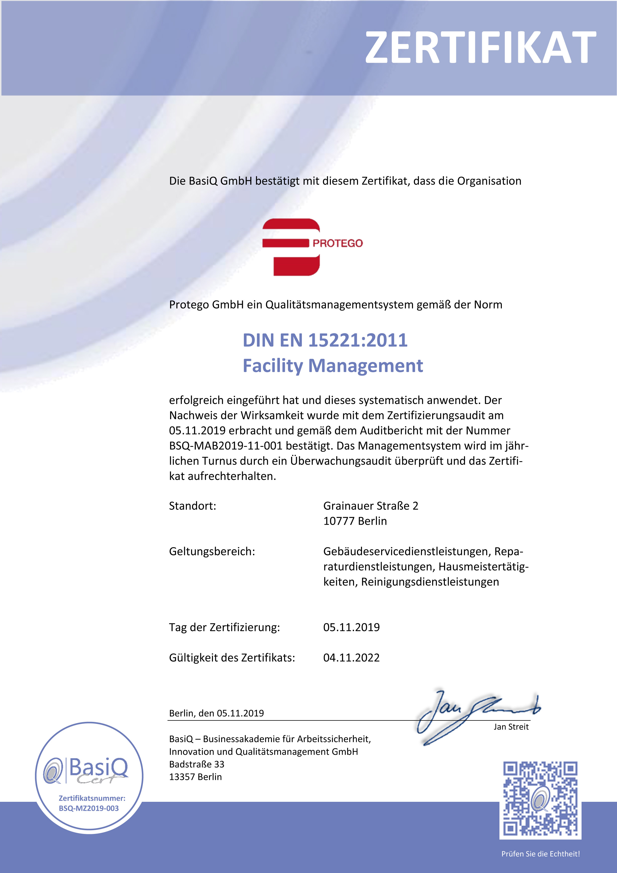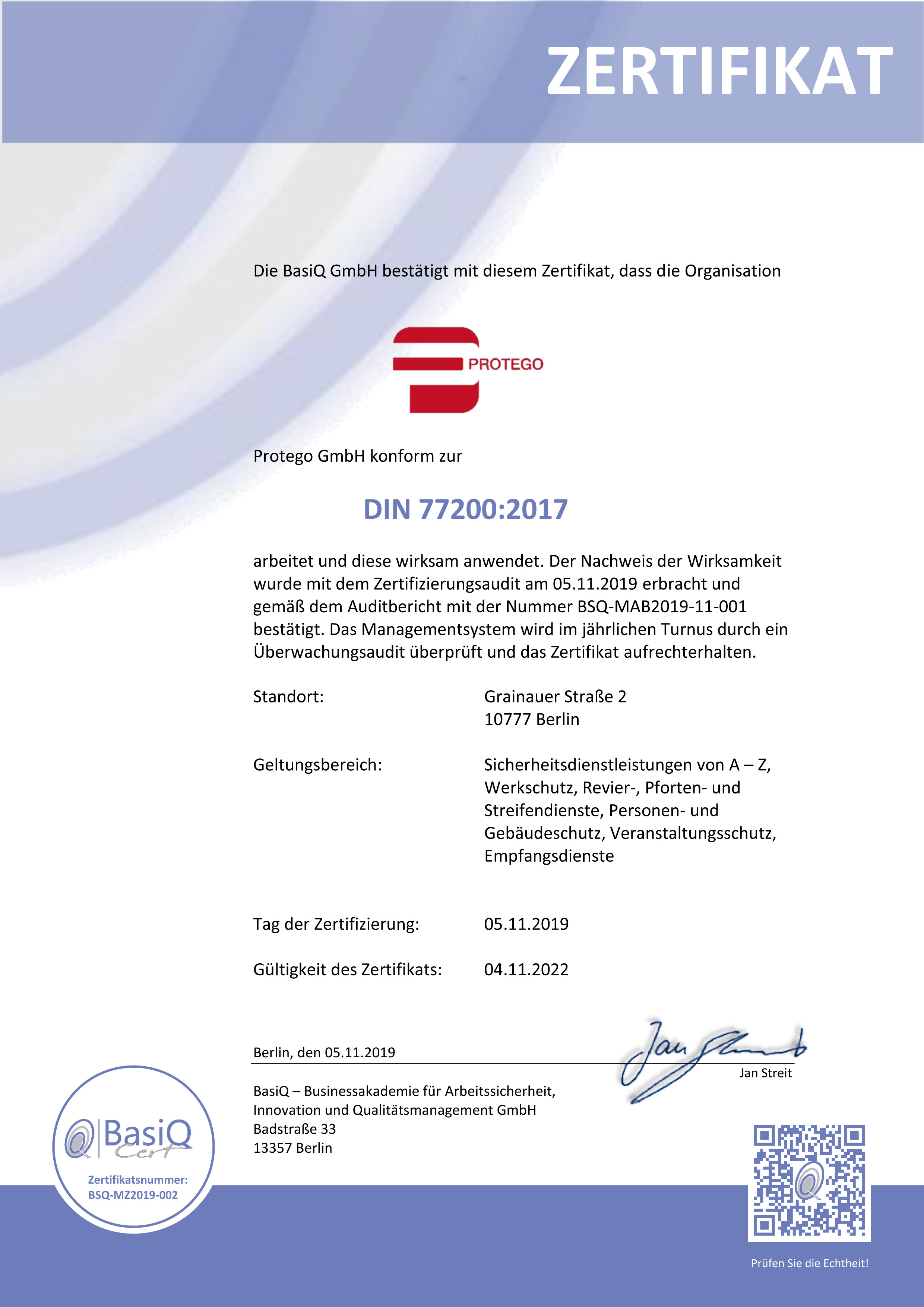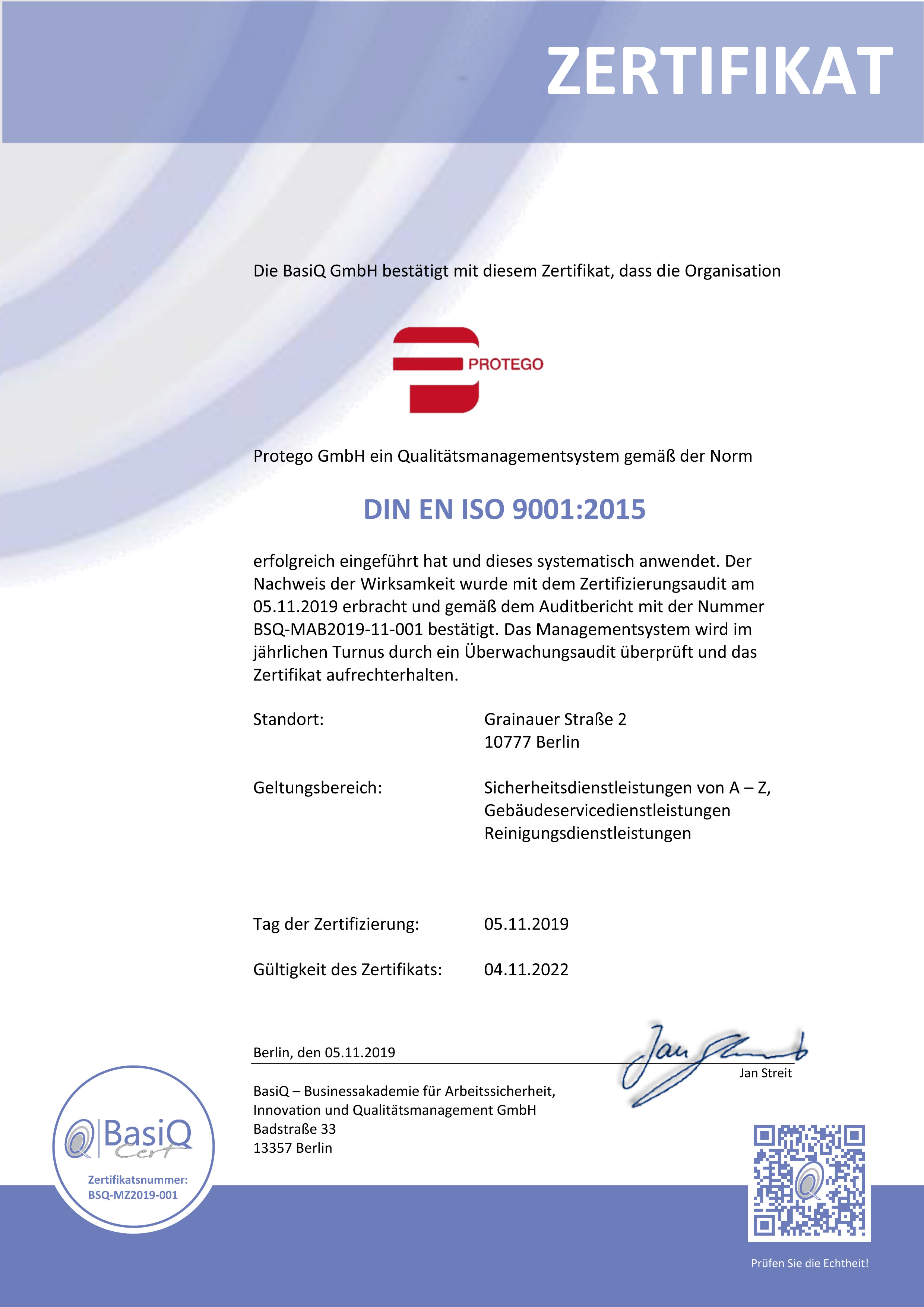 Der hohe Qualitätsstandard unserer Sicherheitsdienstleistungen wird durch unser Qualitätsmanagementsystem gewährleistet, das gemäß DIN EN ISO 9001:2015 und DIN 77200:2008 zertifiziert ist. Die Zertifizierung schafft Transparenz hinsichtlich der innerbetrieblichen Abläufe und Zusammenhänge und bescheinigt der Protego GmbH gleichbleibend hohe Qualität in allen Unternehmensbereichen.